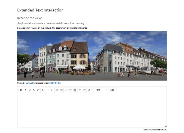 A question asking the candidate to describe something can be constructed using an Extended Text interaction, for example, as in the image below. In this question candidates are asked to describe what they see in the picture.